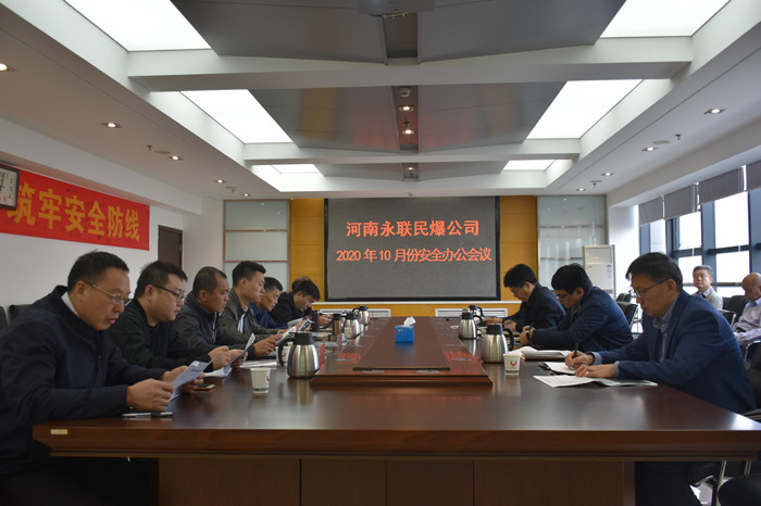 2020年10月30日,河南省永聯民爆器材股份有限公司召開了10月份安全辦公會議,公司領導班子、安委會成員、安委會辦公室成員以及確山縣、衛輝市、永城、鎮平、郟縣、信陽等6家分公司負責人參加了會議。會議由公司副總經理靳義國主持,公司董事長、總經理劉嵩參加會議并講話。